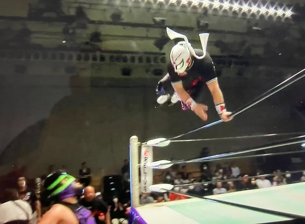 アレプリヘはタンゴを場外へ追いやってラ・ケブラータを放ったがセコンドに誤爆すると、タンゴはトペスイシーダを命中させる。