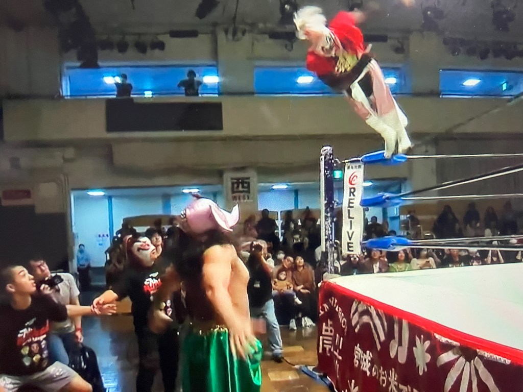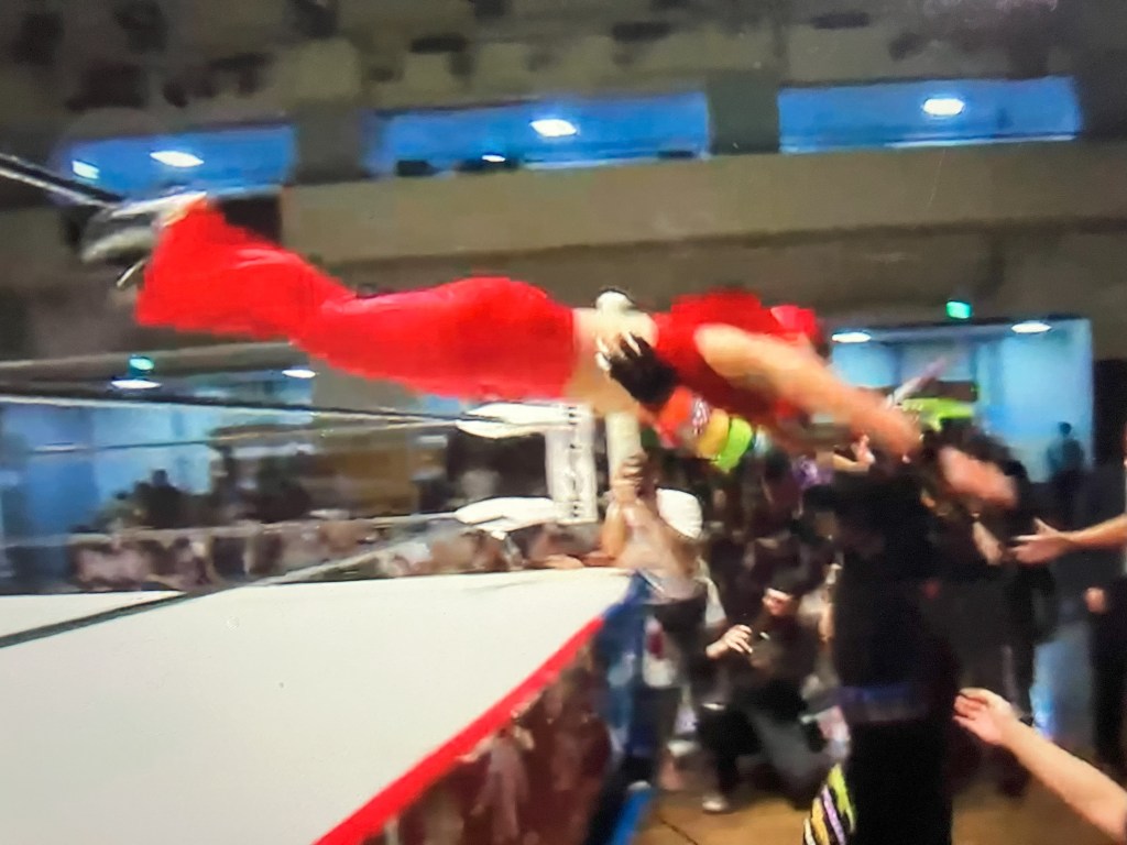 ガネーシャは舞からダブルチョップを連打、舞ながらストンピング、舞ってリズムを掴みながら背m。剣舞はバックエルボーからドロップキックで反撃すると、メサイヤDDTでガネーシャを場外へ出し、トップコーナーからトルニージョを命中させる。