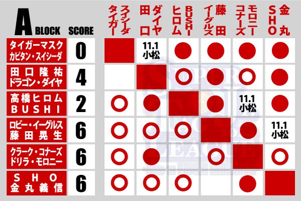【1勝4敗=2点】タイガーマスク 〇カピタン・スイシーダ(9分28秒 ラモトジクレタ)【2勝3敗=4点】田口隆祐 ×ドラゴン・ダイヤ