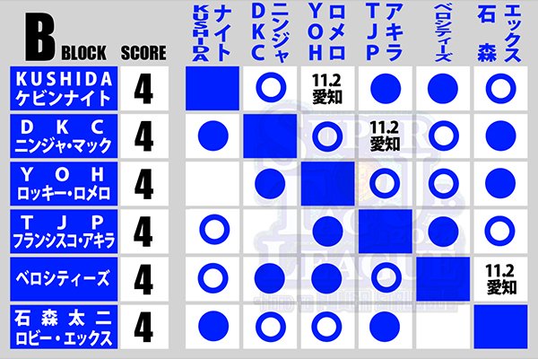 【3勝2敗₌6点】KUSHIDA 〇ケビン・ナイト(17分6秒 片エビ固め)【2勝3敗₌4点】YOH ×ロッキー・ロメロ