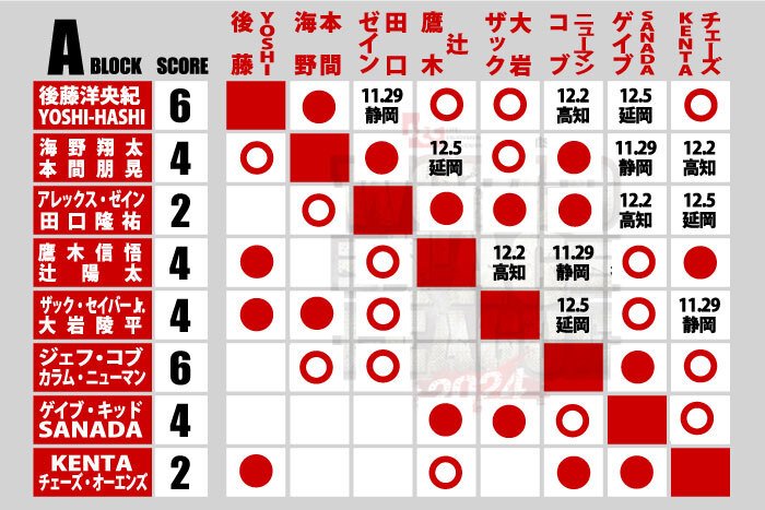 【3勝1敗=6点】〇後藤洋央紀 YOSHI-HASHI(23分1秒 片エビ固め)【2勝2敗=4点】ザック・セイバーJr. ×大岩陵平