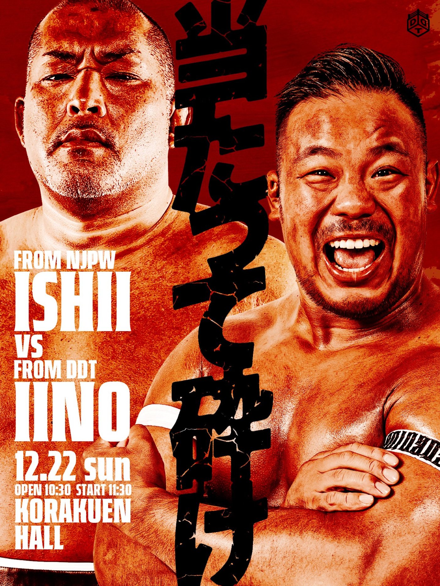 DDT後楽園大会のセミファイナルでは飯野が新日本プロレスの石井と対戦、ロックアップから石井がヘッドロックで主導権を握るも、ロープへ振った飯野とぶつかり合いに突入するが、身長差とラグビー仕込みのパワーで飯野が制し、ボディースラムからバーニングエルボーを狙う。しかし石井は阻止して、エルボーのラリーから逆水平チョップを繰り出し、飯野を崩していく。