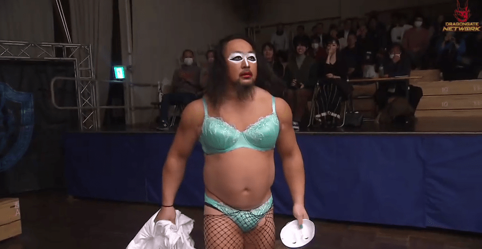 第2試合で行われたお笑いゲート選手権に王者のランジェリー武藤に吉田隆司が挑戦も、吉田はブラジャーとパンティ、網タイツ姿だけでなく、女性の化粧をして吉田隆子として登場する。