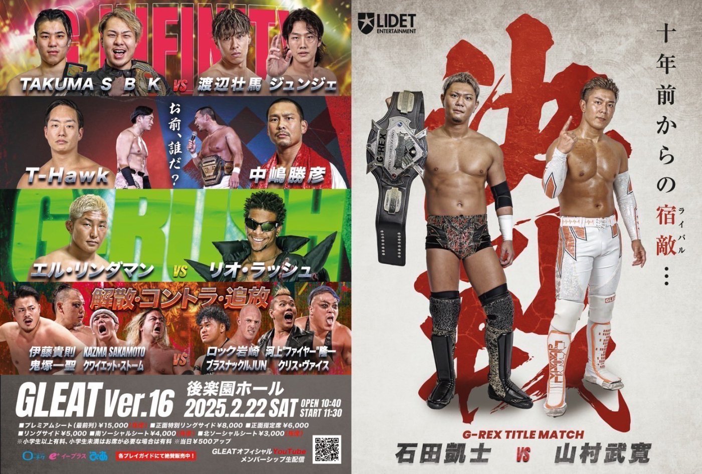 GLEAT今年初の後楽園大会が開催され、メインは石田の保持するG-REX王者に山村が挑戦、石田と山村はDRAGON GATE時代からの同期で競い合ってきたが、2019年に山村が第三頸椎第四頸椎の脱臼という重傷を負ってから長期欠場、2023年に復帰し復帰戦の相手は石田が務めた。今回は頂点の王座をかけて後楽園で対戦となった。