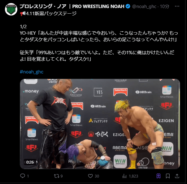 第3試合のAMAKUSA&宮脇&小垰vs進&政岡&ガイヤのF-SWAGが、入場する宮脇が子供のファンにさーびすをしているところで、政岡がマイクで「おいおいおい、宮脇。なにチンタラ入場しとんねん。お前、俺らに1回負けてんのやぞ。危機感ないんか? やっぱりNOAHジュニアはしょうもないな」と挑発。入場するあまみや&小峠をF-SWAGが襲撃し、試合開始となる