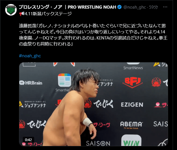 NOAH新潟大会のメインイベントではGHCナショナル王座決定トーナメントファイナルが開催され、ガレノと遠藤の間で空位の王座が争われることになった。
