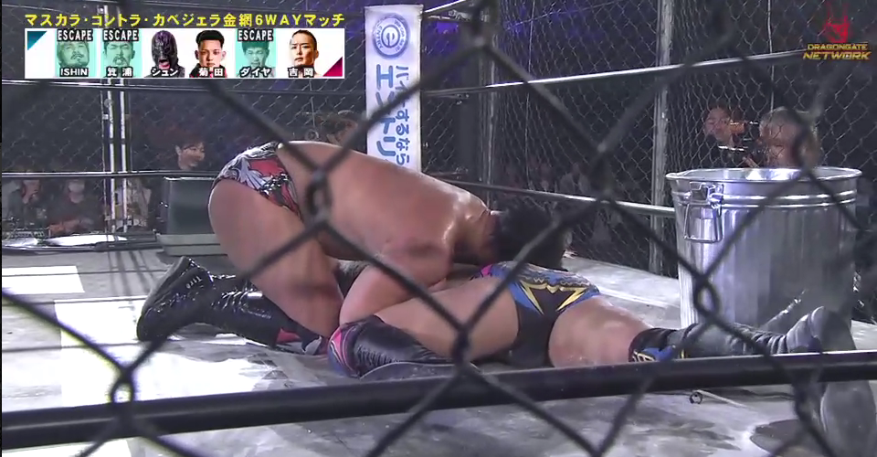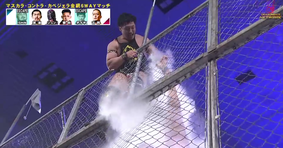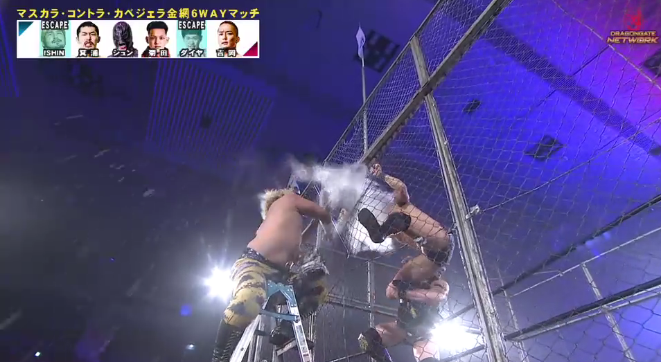 DRAGON GATE愛知大会のメインは敗者負け残りマスカラ・コントラ・カベジェラ 金網 6WAYマッチが行われ、今年は内紛が起きているDCourageから吉岡勇紀、菊田円、ドラゴン・ダイヤ、同じく内紛が起きているZ-BRATSからはシュン・スカイウォーカー、箕浦康太、ISHINの6選手が金網の中に入った。