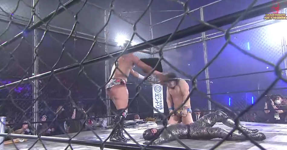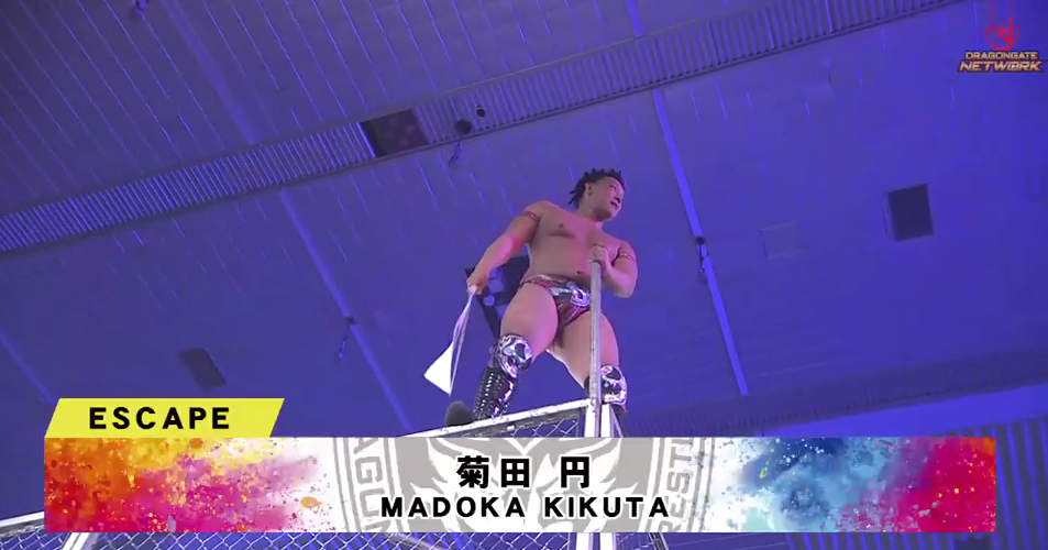 DCourageが攻勢を続ける中、5分経過でエスケープ可能になると、DCourageが揃ってエスケープを狙ったが。場外のZ-BRATSが板や鉄パイプで阻止も。菊田が金網際でISHINとシュンに尻爆弾連発すれば、箕浦が菊田を標識板で迎撃、シュンが吉岡にバイシクルキックを放つ。
