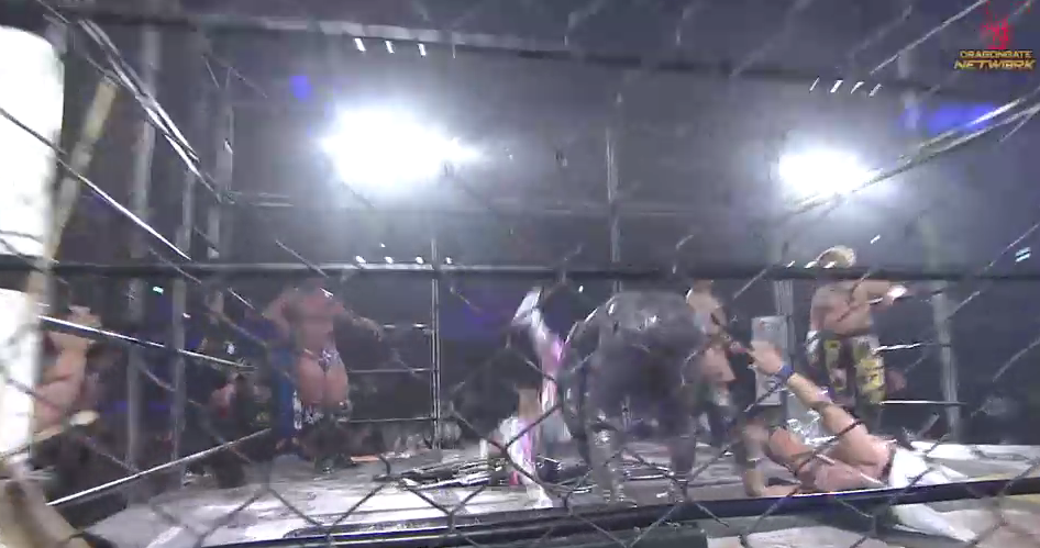 吉岡が追いかけるシュンを落としエスケープを狙うが、場内が暗転すると、ギアニー・ヴァレッタが乱入し金網を揺らして吉岡のエスケープを阻止するだけでなく。トラッシュ缶やイスを投げ込み、斎了GMの指示で若手がギアニーを拘束したところで、良弥が金網からのプランチャを敢行、若手や斎了GMがギアニーを台車に縛りつけて退場させる。