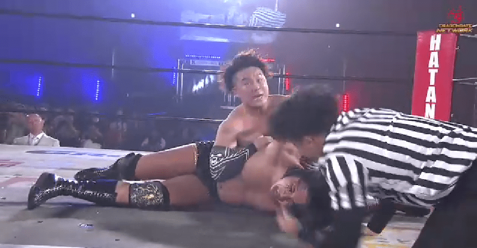 第4試合のオープン・ザ・トライアングルゲート選手権、王者組のススム&ハルク&KagetoraのPARADOXvsマシーンJ&Kzy&フラミータのNATURAL VIBESは、フラミータがティヘラでススムを場外へ追い落とすと、ノータッチトペ・コンヒーロを命中させ、マシーンJがKagetoraをボディースラムからヒップトスで叩き付け、ブレイクダンスエルボーで攻勢をかける。