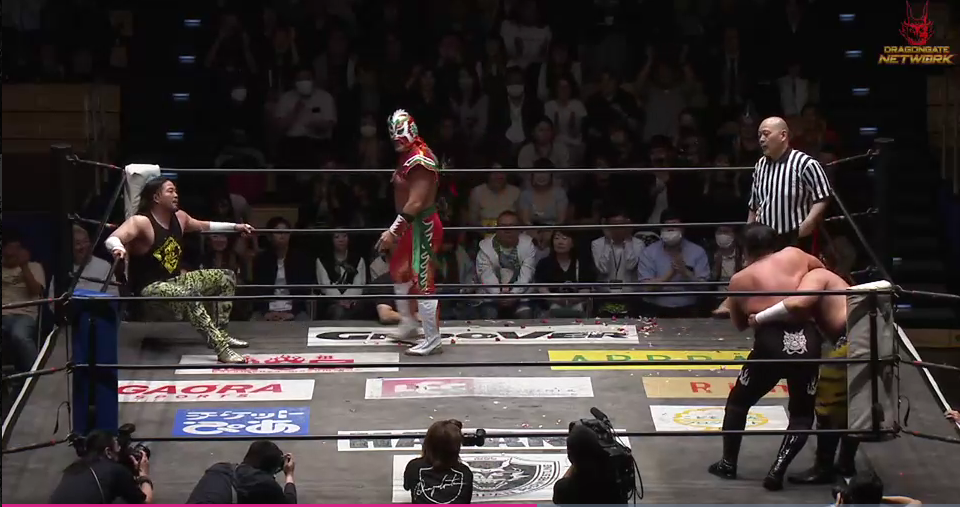 第5試合ではZ-BRATS入りを果たした菊田がシュンと組んで、YAMATO&ハルク対戦するが、菊田がいきなりハルクにラリアット、YAMATOには尻爆弾を浴びせ、シュンも加わり連係でYAMATO&ハルクを蹂躙する。ハルクは菊田に張り手の連打から浴びせ蹴り、バイシクルキックで反撃するとYAMATOがGo to HospitalⅡを決めるが。菊田はYAMATOにラリアット、シュンはハルクにカウンターブレーンバスターと攻め、菊田はYAMATOに再びラリアット、ハルクにショルダータックルからローリングラリアットで3カウントを奪い速攻で勝利、試合後も菊田がこれが新しいZ-BRATS、目的はDRAGON GATEを破壊だと断言すれば、シュンは観戦していた宮根誠司さんを呼び、ミヤネ屋に特別コメンデーターを要求したことにもかからずウヤムヤになったで腹いせに、ミヤネ屋の裏番組であるゴゴスマと、ミスターサンデーに情熱大陸に出演するとアピールしたことで、宮根さんも抗議するも、前回のGATE OF 宮根の相手だったグレート・O・カーンはせこすぎると抗議する。これに怒った宮根さんは次なる刺客を差し向けると宣言、斎了GMも承諾、GATE OF 宮根は後楽園で開催が決定する。