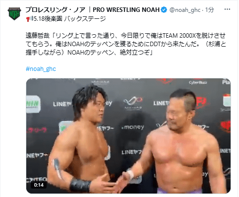 NOAH後楽園大会の第3試合では丸藤&杉浦&北宮が遠藤&ダガ&オオワダサンのT-2000Xと対戦し、オオワダサンが杉浦にライトニングスパイラルを仕掛け、串刺しスピアーを回避して片足コードブレイカーを決めるが、杉浦を罵倒している隙に、丸藤がフックキックを放つと、杉浦がオオワダサンに鬼エルボー、キチンシンク。ランニングニーの連続攻撃からカバーするが、ヨシ・タツがレフェリーを引きずり出して乱入する。ヨシ・タツはトンファーを遠藤に手渡そうとするが、遠藤はこれを拒否すると。代わりにエクスプロイダーでヨシ・タツをKO、杉浦がオリンピック予選スラムでオオワダサンから3カウントを奪い勝利となる。試合後に杉浦は一緒に頂点を目指そうと遠藤に呼びかけると、遠藤はT-2000X脱退を宣言、杉浦と共闘を決意する。