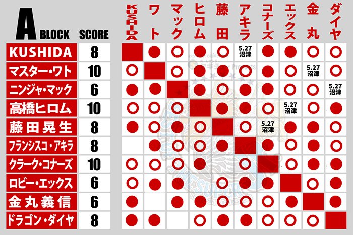 【4勝4敗=8点】〇KUSHIDA(4分20秒 逆さ押さえ込み)【3勝5敗=6点】×金丸義信