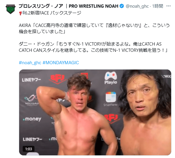 第2試合の北宮&小田嶋vsAKIRA&NOAH初参戦のドゥガンは、長時間捕まった小田嶋はAKIRAにドロップキックを放つと、代わった北宮がショルダータックル、串刺しラリアットからショルダータックル、セントーンを連発。ドゥガンにもセントーンで猛反撃する。