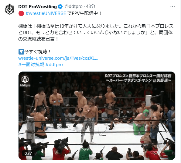 結局この試合のテーマは新日本プロレスとDDTの関係が一時途絶するきっかけになった10年前で、棚橋がDDTとの対抗戦を考えて「DDTと横一線に見られては困る」と発言したにもかかわらず、内外から思わぬ反発を受けた打だけでなく、棚橋と当時ヤングライオンYOHが出場し、DDT側に謝罪したが、政治的な事情も絡んで関係を絶たざる得なくなった。
