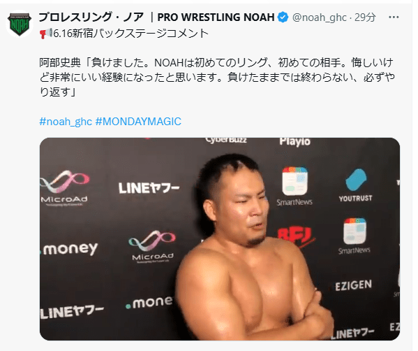 〇佐々木憂流迦(14分24秒 バックドロップホールド)×阿部史典
