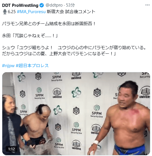 そして大家が去ると髙木プロデューサーが登場し、このチームとのタッグを要請すると、バラモン兄弟が現われ、タッグ結成を呼び掛けるが、永田が丁重に断って去り、バラモン兄弟はバックステージまで追いかけていった。また髙木の呼びかけてDDT旗揚げメンバーであるMIKAMIが登場、超日本プロレス旗揚げ戦に参戦が決まりTAKAみちのく対戦することになった。