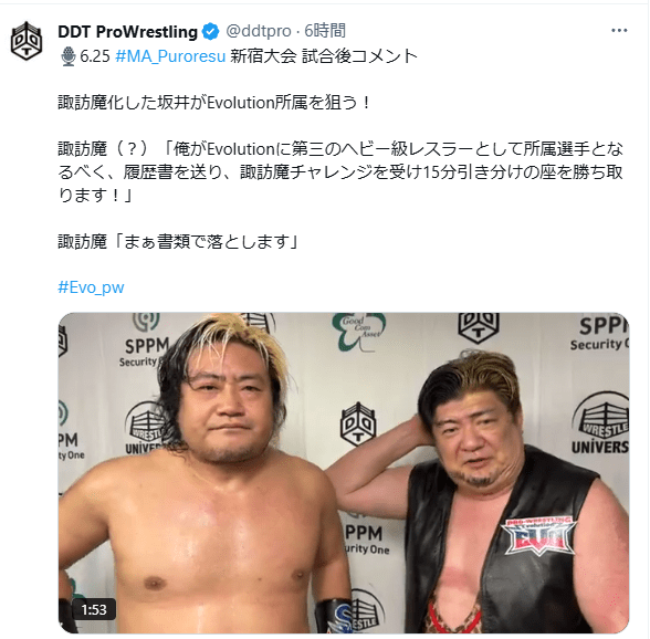 セミファイナルではマッスル坂井がEvolutionの諏訪魔と対戦するも、先に入場した坂井は、対戦相手が諏訪魔ということで「お別れの挨拶」として、自分がスーパー・ササダンゴマシンであることを明かし。さらにカードを組んだ髙木に文句を言いつつ、「小細工なしの真っ向勝負」をアピールした後で、諏訪魔が登場する。