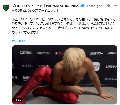 OZAWAの旋風脚を回避した拳王が輪廻を放つが、OZAWAも旋風脚で応戦、読み合いから末、OZAWAがフラットライナーを決め、ライオンサルトを命中させる。OZAWAはビッグベンエッジを狙ったが、逃れた拳王はドラゴンスープレックスから蹴暴、しかしPFSを回避されると、OZAWAはニールキックを放つ。