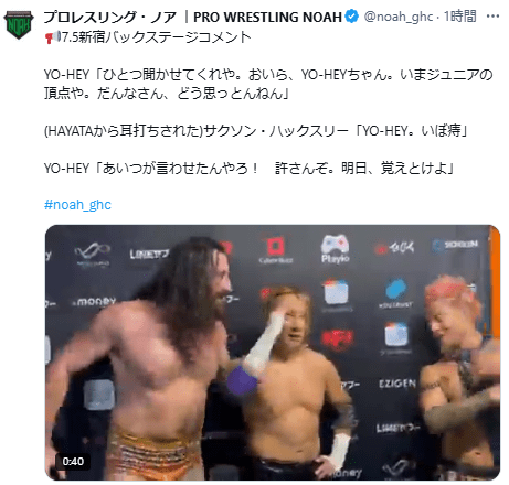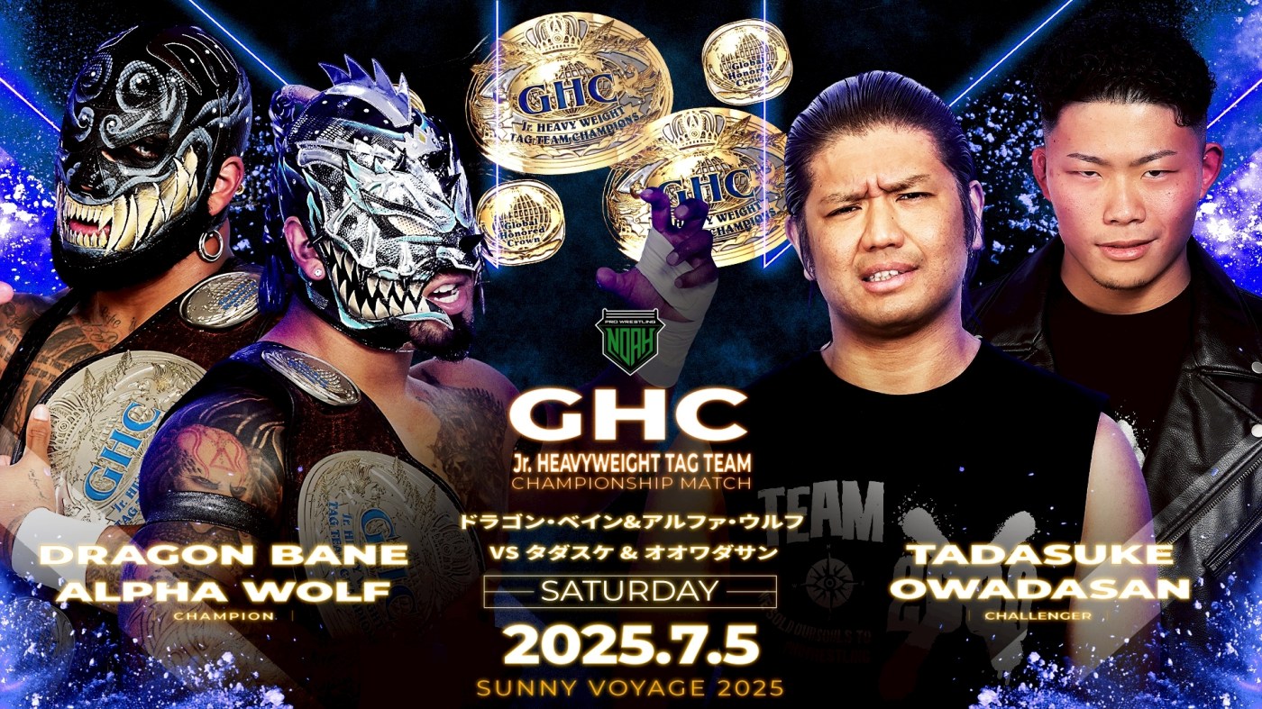 今年20周年を迎えた新宿FACEでNOAHが開催され、メインはGHCジュニアタッグ選手権、王者のベイン&ウルフのロス・ゴルベアドーレスに、T-2000Xからタダスケ&オオワダサンが挑戦、オオワダサンとタダスケは、ベインから奪ったマスクを掲げて登場すると、王者組に入場中のゴルベアドーレスに奇襲を仕掛け、試合開始早々の場外戦で主導権を握る。