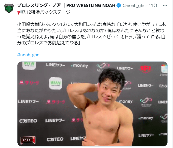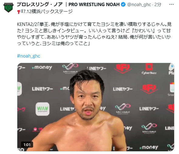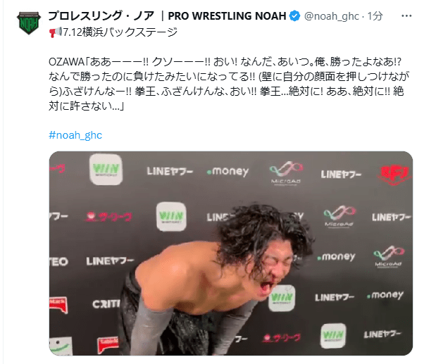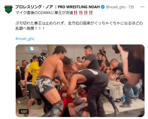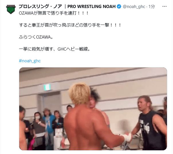 NOAH横浜ラジアントホール大会のメインはGHCヘビー級選手権前哨戦が行われ、OZAWA&ダガ&タダスケ&オオワダサンのT-2000Xは、拳王&KENTA&憂流迦&小田嶋が対戦するが、試合開始前からOZAWAがYouTube用にスマホで撮影しながら入場すると、開始から拳王を撮影したところで、払い落とした拳王がコーナーでナックル攻撃を仕掛けるが、OZAWAは場外へ退避する。