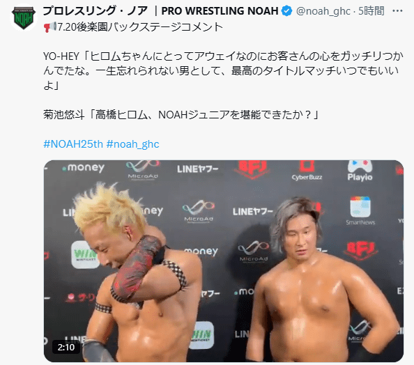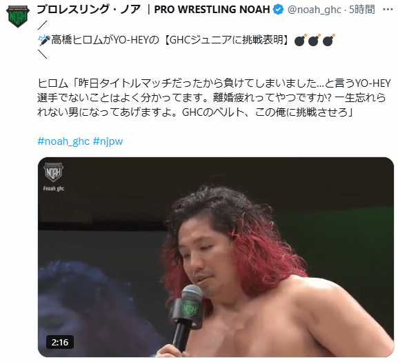 試合後、マイクを持ったヒロムはHAYATAとの”離婚”で疲れが見えるYO-HEYに対し、ヒロムは「寂しそうだな。俺が一生忘れられない男になってやる」とGHCジュニア王座挑戦を表明。YO-HEYは「言い訳はしない。このベルトをかけてぶっ潰してやる」と受諾した。