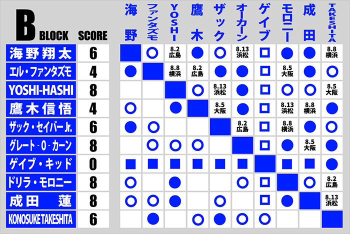 これでBブロックは今日、不戦勝で公式戦が組まれなかったYOSHI-HASHIを含め、O・カーン、モロニー、成田がトップを形成し、それを海野、ザック、TAKESHITAが追いかける展開となった、