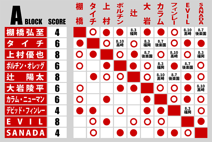 【4勝2敗=8点】〇上村優也(18分40秒 閂スープレックスホールド)【2勝4敗=4点】×棚橋弘至