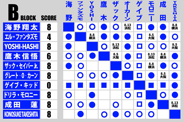 Bブロックは海野、YOSHI-HASHI、ザック、O・カーン、モロニー、成田、TAKESHITAがトップという混戦となった。