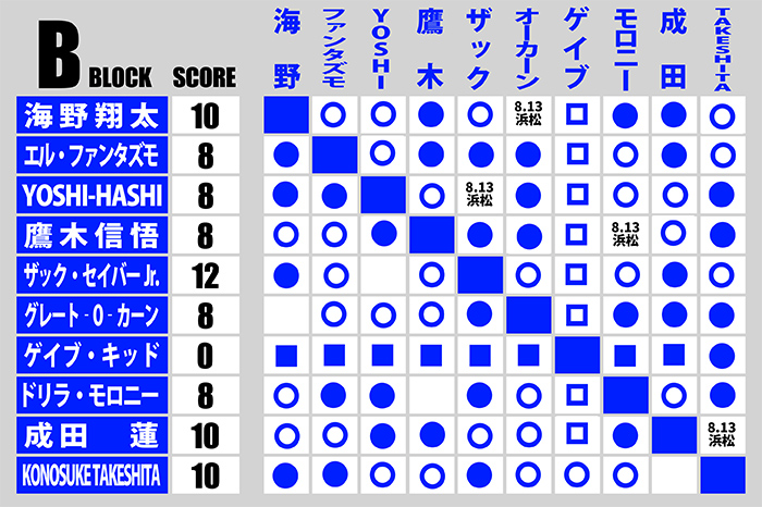 いよいよ浜松大会でBブロックも最終公式戦を迎えた『G1 CLIMAX 35』、ここまでの経過を振り返ると、ザックがブロック突破を決めており、残り2枠を残りの8選手で争う展開となった。