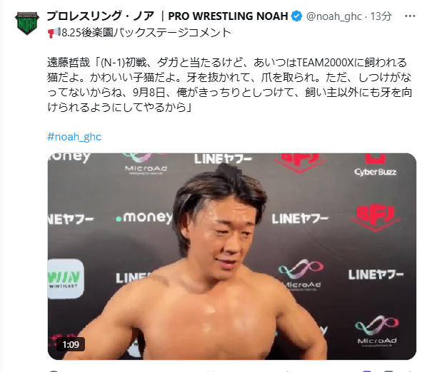 その間にKENTAが清宮にブサイクの膝蹴りからgo2Sleep狙うが、清宮が首固めで3カウントを奪い勝利、試合後にN-1開幕戦で対戦するKENTAをマイクで挑発した清宮は、OZAWA推しのNOAHにも怒りをぶつけ、N-1優勝をアピールする。