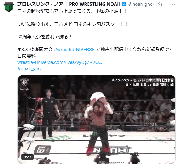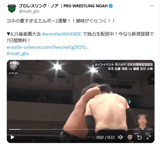試合は池田大輔が入ると、バチバチの世界になり、池田が今年で57歳となりながらも、体格差のある石川相手に真正面から挑んでいった。潮崎とヨネもバチバチやり合ったが、バチバチこそTEAM NOAHの原点でありヨネの減点であることを感じさせた試合となった。