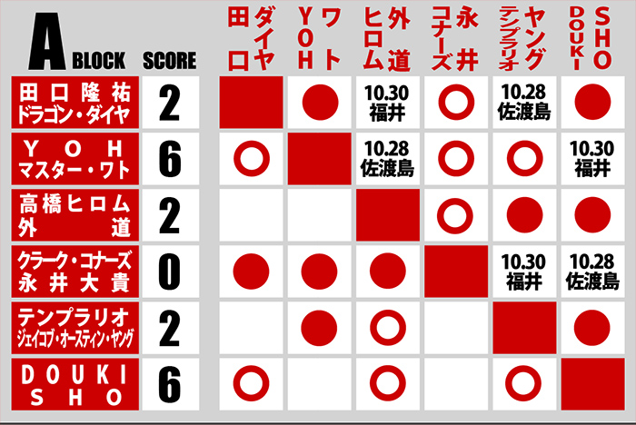 これでAブロックは全勝のSHO&DOUKI、YOH&ワトのマッチレースの様相となった。