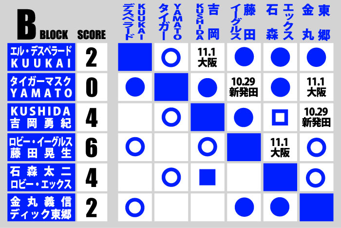【2勝1敗=4点】石森太二 〇ロビー・エックス()【3敗=0点】×タイガーマスク YAMATO