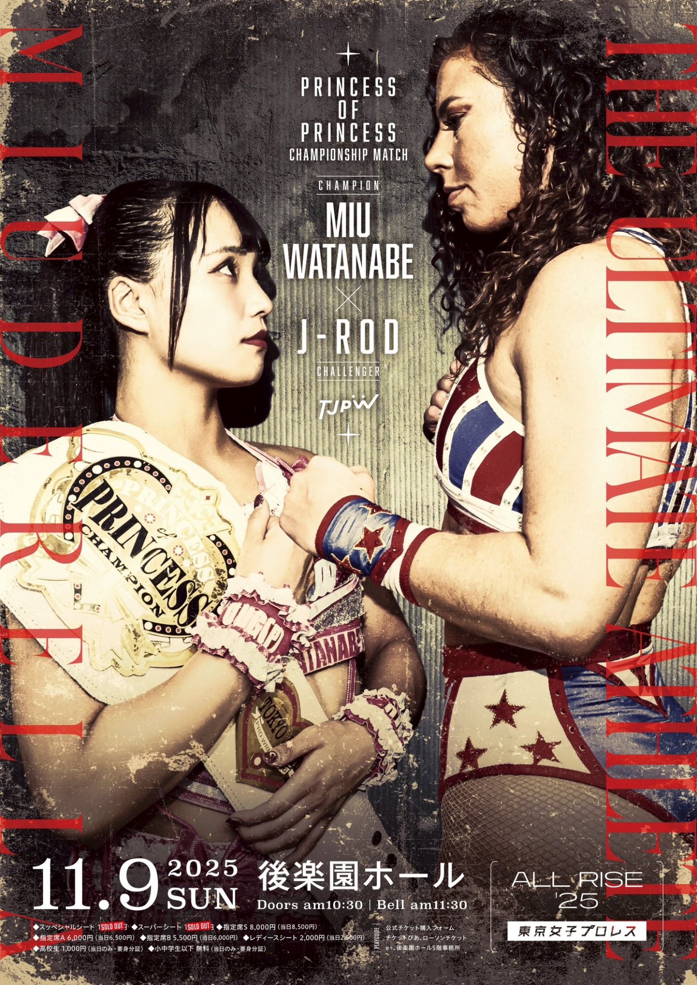東京女子プロレス後楽園ホール大会のメインイベントでは、プリンセス・オブ・プリンセス選手権が行われ、王者・渡辺未詩にアメリカからの刺客であるJ-RODが挑戦した。J-RODは米オハイオ州出身で、2022年にデビューしたばかりながら、わずか3年でその名を全米に轟かせた超新星で、身長178cmの高身長と均整の取れた体格を誇り、NJPWアカデミー在籍経験も持つ。パワー、テクニック、ファイトの全てを兼ね備えた究極のアスリートであり、OVW(Ohio Valley Wrestling)女子王座をはじめとする数々のタイトルを獲得した実力者が、美詩に挑んだ。