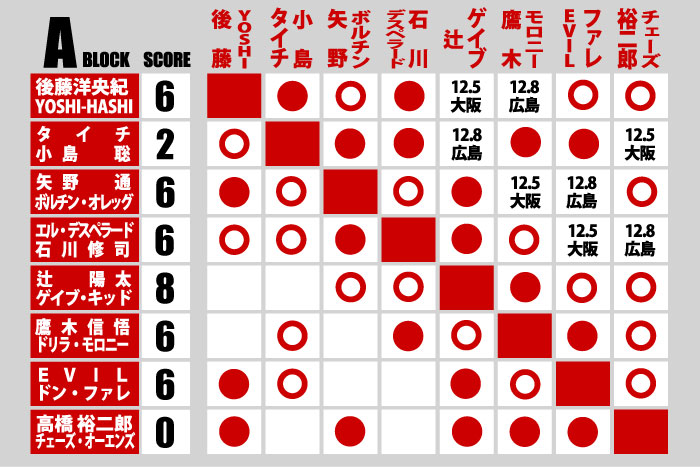 これでAブロックは残りに2銭となり、辻&ゲイブが単独トップ、毘沙門、矢野&ボルチン、デスペラード&石川、WARDRAGONS、EVIL&ファレが追いかける混戦となった。