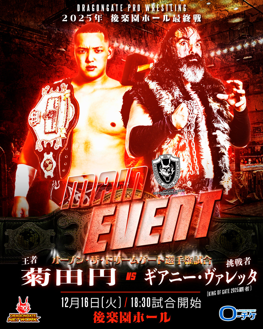 DRAGON GATE、今年最後の後楽園ホール大会のメインはオープン・ザ・ドリームゲート選手権が行われ、王者の菊田円に、KING OF GATE2025を優勝したギアニー・ヴァレッタが挑戦した。