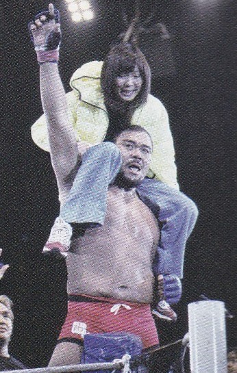 その後、アントニオ猪木氏の元で格闘技のトレーニングを行い、2001年大晦日の「INOKI BOM-BA-YE」に出場。アキレス腱断裂で欠場となった藤田和之の代役として、K-1ファイターのジェロム・レ・バンナとMMAルールで対戦し、ギブアップ勝ちを収めたことで一躍ブレイクした。